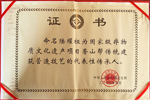 2007年 6月,集团陆耀祖大师被评为国家级非物质文化遗产项目香山帮床头建筑营造技艺的代表性传承人。这是集团第一位国家非遗传承人。
